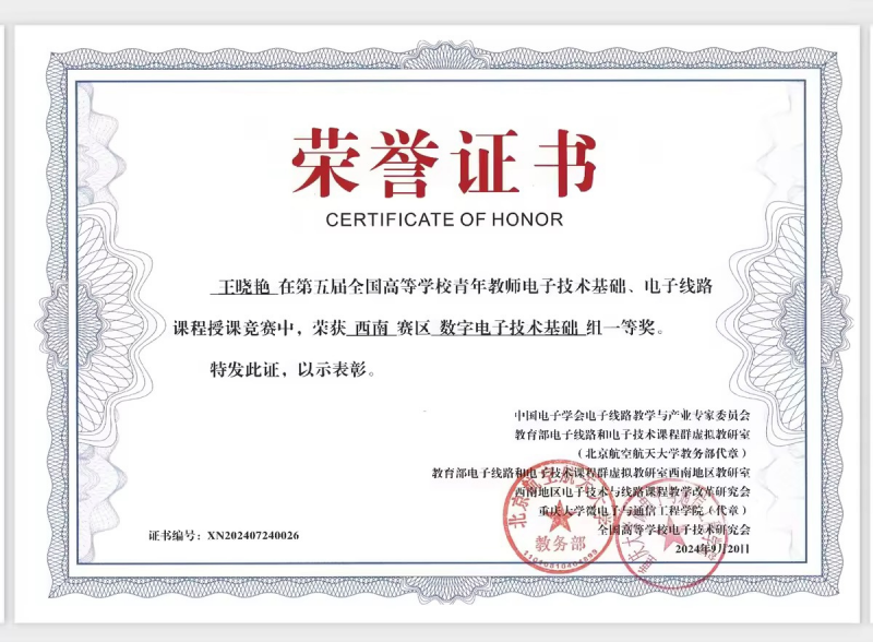 第五届全国高等学校青年教师电子技术基础、电子线路课程授课竞赛在大理大学举行,kaiyun体育大数据与智能工程学院教师王晓艳荣获西南赛区数字电子技术基础组一等奖。