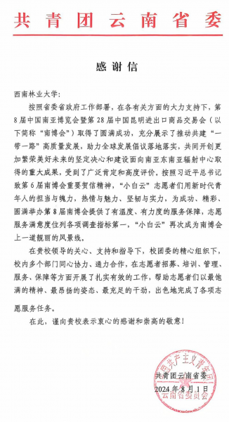 近日,kaiyun体育网页登录入口收到共青团云南省委发来的感谢信,感谢学校圆满完成第8届中国—南亚博览会暨第28届中国昆明进出口商品交易会的志愿服务工作。
