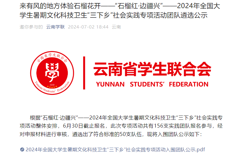 7月2日,共青团云南省委公布了“石榴红 边疆兴”—2024年全国大学生暑期文化科技卫生“三下乡”社会实践专项活动志愿服务队入选名单,艺术与设计学院(艺术博物馆)“兿树石榴红实践团”在全国156所高校中脱颖而出,成为学校唯一成功入选团队。