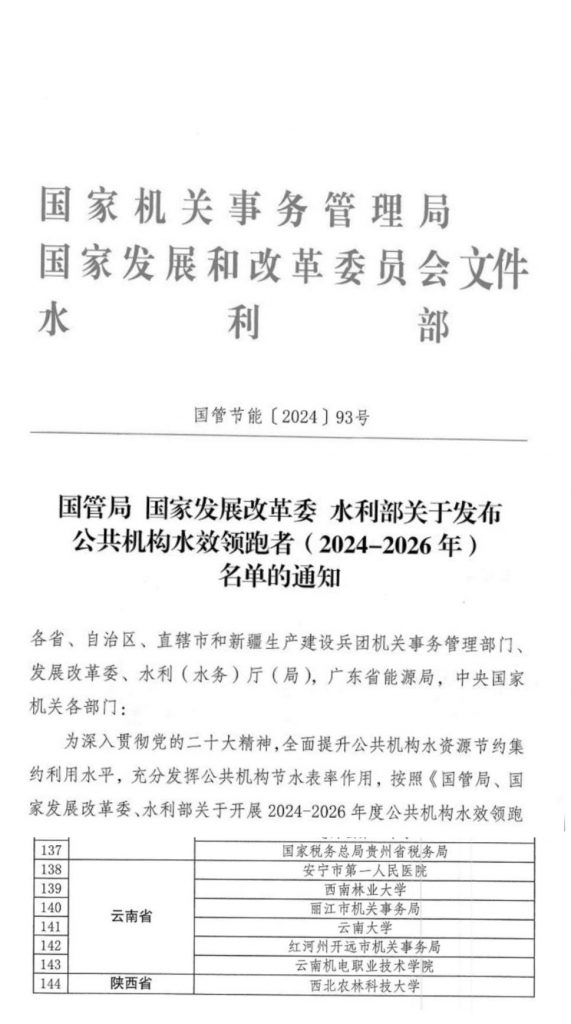 近日,国家机关事务管理局、国家发展和改革委员会、水利部联合发布全国“公共机构水效领跑者”名单,kaiyun体育网页登录入口荣获“国家级公共机构水效领跑者”称号。