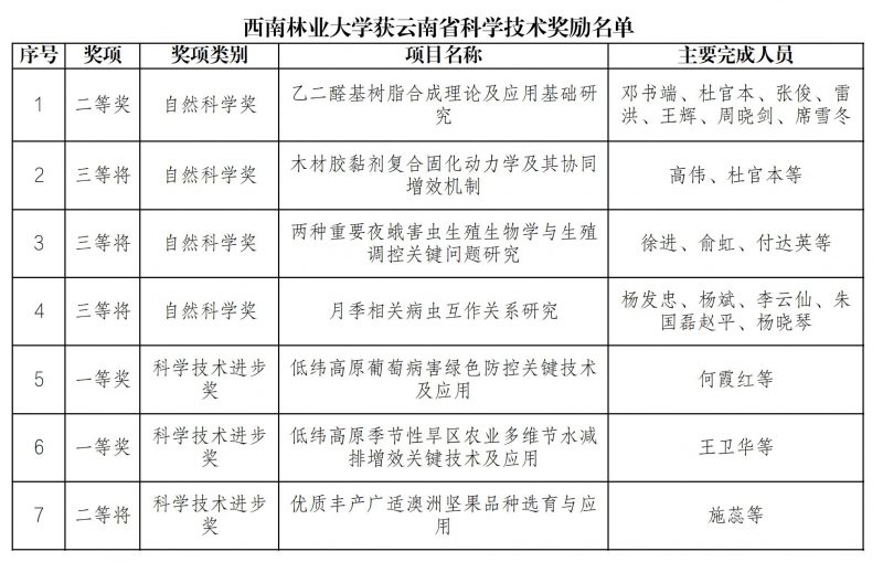 kaiyun体育邓书端、高伟、徐进、杨发忠牵头的《木材胶黏剂复合固化动力学及其协同增效机制》《两种重要夜蛾害虫生殖生物学与生殖调控关键问题研究》《月季相关病虫互作关系研究》等项目分别荣获自然科学奖二等奖、三等奖。