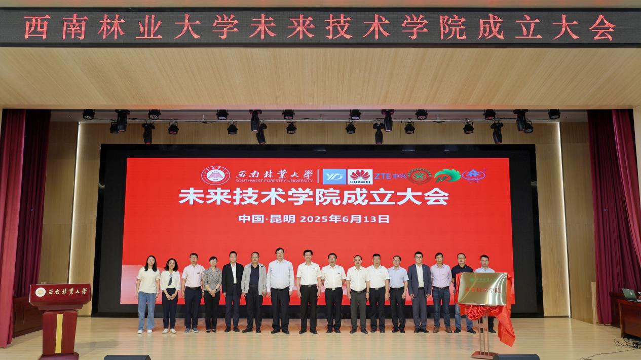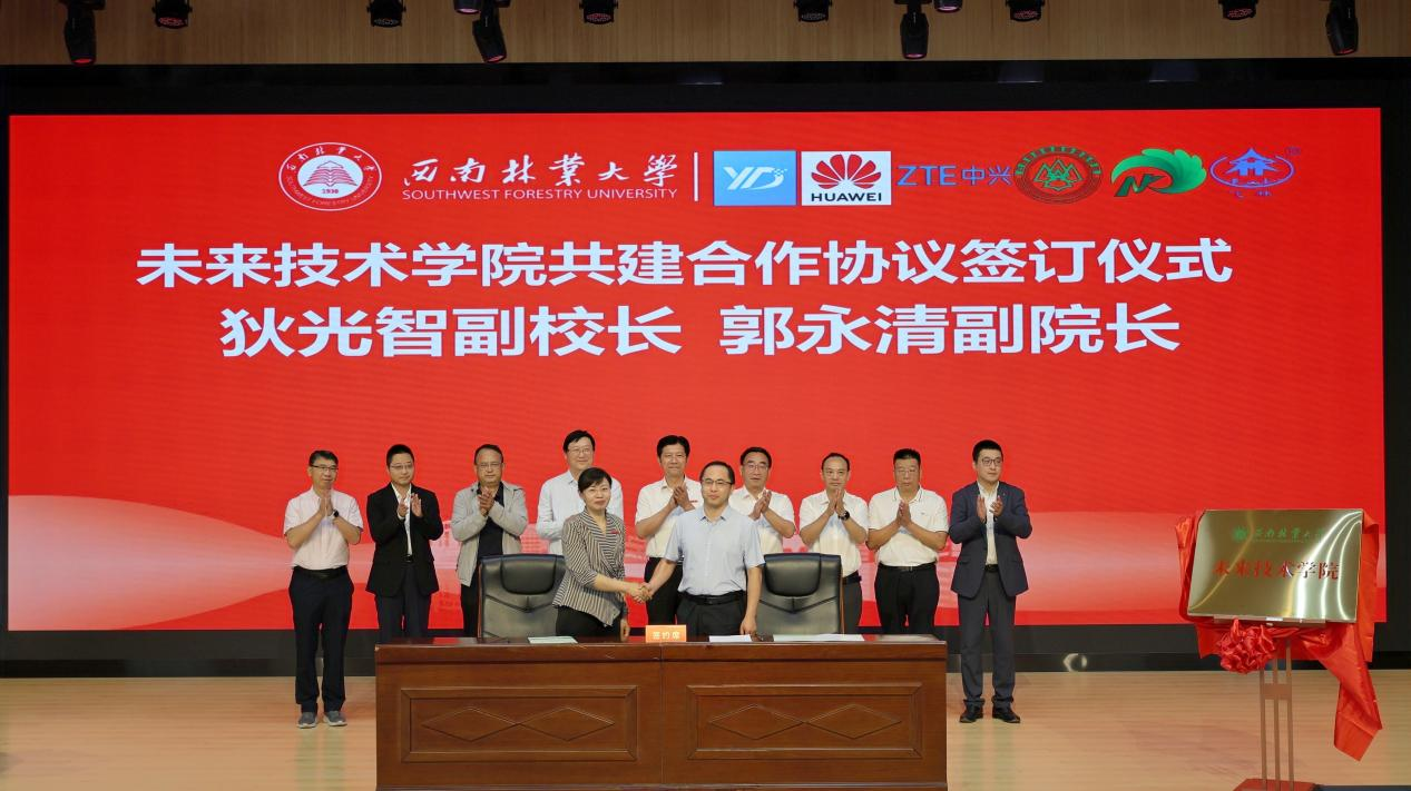 王卫斌宣读成立未来技术学院的文件。李永勤、王卫斌、余正涛共同为未来技术学院揭牌。狄光智代表学校与云南省林业和草原科学院签订了未来技术学院共建合作协议。