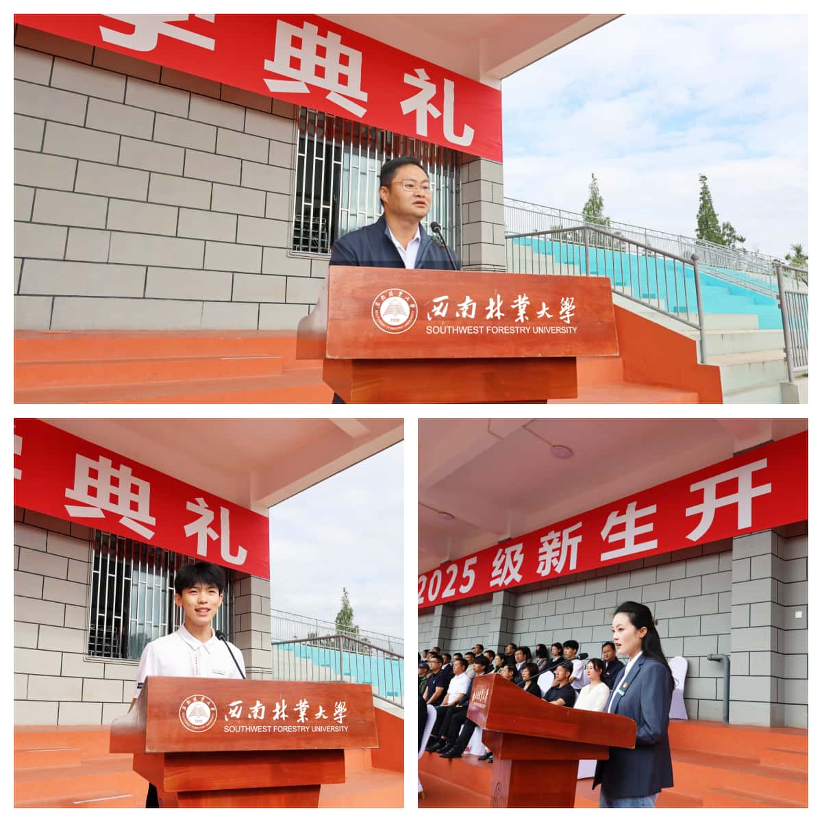 新生代表林学院2025级智慧林业专业王梓涵,在校生代表材料与化学工程学院家具设计与工程专业2023级硕士研究生余思影,教师代表、博士生导师麦强盛先后发言。