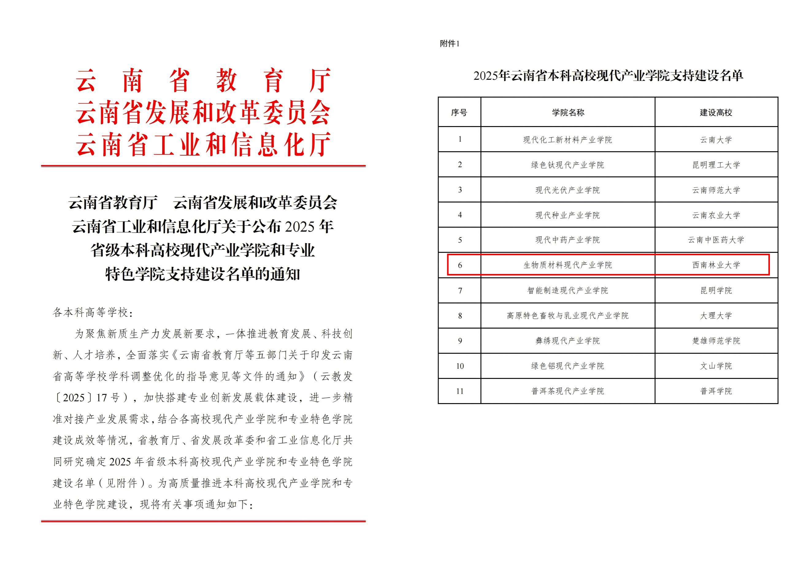 近日,云南省教育厅、云南省发展和改革委员会、云南省工业和信息化厅联合发布《关于公布2025年省级本科高校现代产业学院和专业特色学院支持建设名单的通知》,kaiyun体育申报的“生物质材料现代产业学院”成功入选,获批省级现代产业学院建设立项。