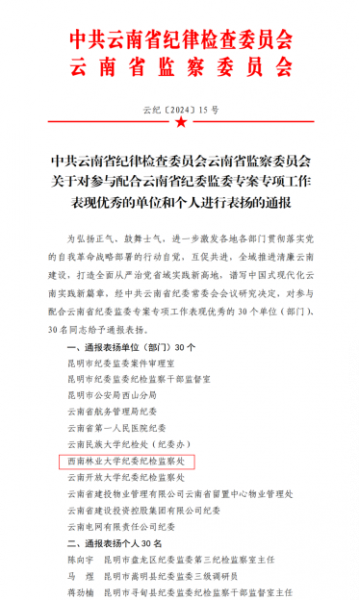 云南省纪委监委印发《中共云南省纪律检查委员会云南省监察委员会关于对参与配合云南省纪委监委专案专项工作表现优秀的单位和个人进行表扬的通报》,对kaiyun体育纪检监察机构参与配合云南省纪委监委专案专项工作表现优秀给予通报表扬。