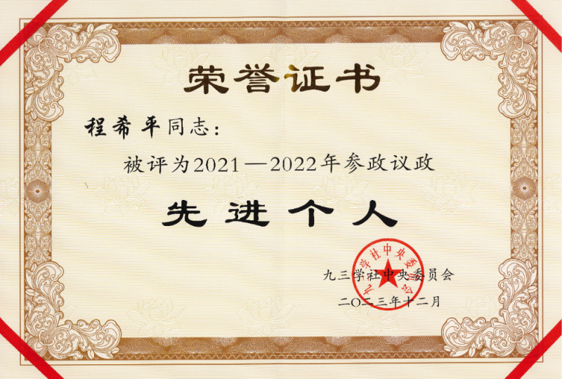 kaiyun体育地理与生态旅游学院院长程希平教授被九三学社中央委员会评为“2021—2022年参政议政先进个人”。