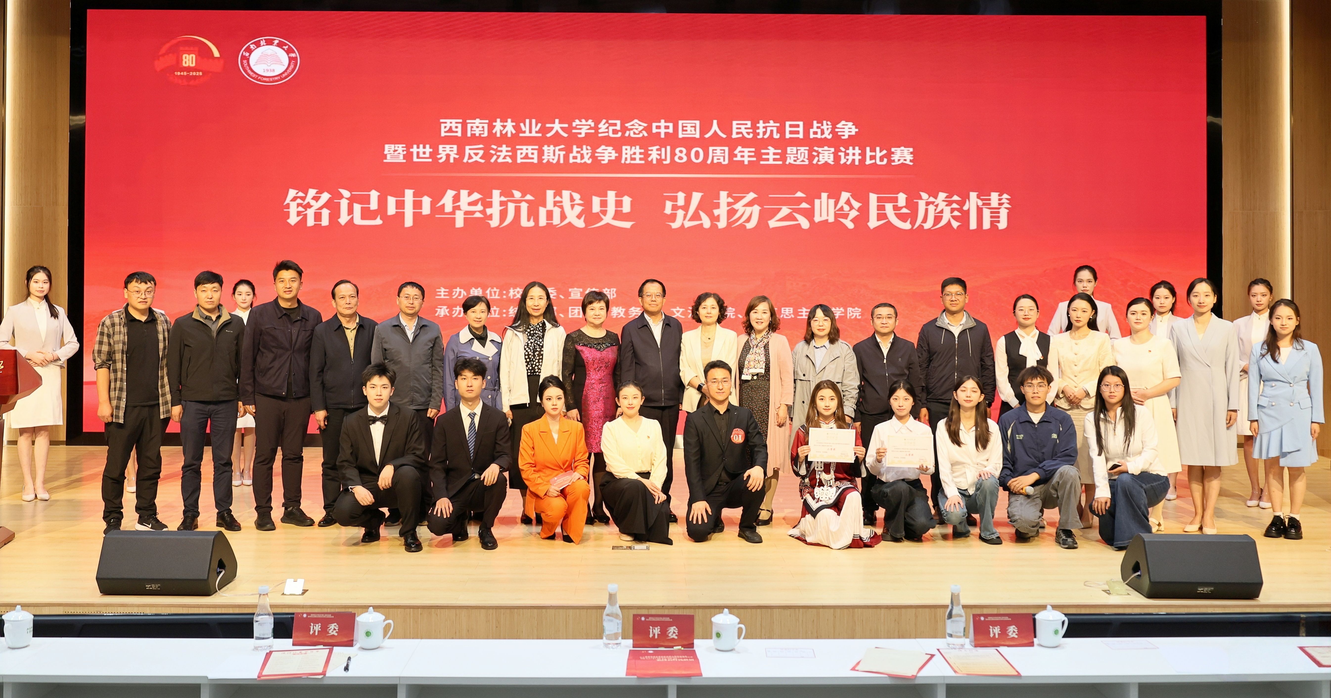 在颁奖仪式上,学校党委副书记魏宏回顾了中国人民14年艰苦卓绝的抗战历程,特别聚焦云南这片热土上的抗战记忆,26个民族不分你我、携手抗敌,无数群众自发组建担架队、运输队支援前线,用血肉之躯谱写了“中华民族一家亲”的英雄赞歌。结合学校办学特色与时代要求,魏宏代表学校党委对全体师生提出三点希望。一是以史为鉴铸信仰,筑牢理想信念之基,始终保持爱国报国的赤子之心;二是以情为纽聚合力,传承抗战时期凝结的深厚民族情谊,主动投身云南民族团结进步示范区建设,以实际行动维护民族和谐;三是以行践诺担使命,立足林业高等教育定位,将爱国情怀转化为守护绿水青山、服务国家生态文明建设的具体实践。