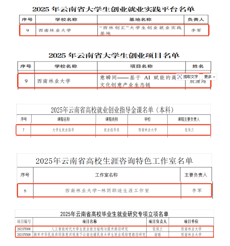 自2025年6月以来,经学校就业工作处(创新创业学院)自主申报推荐、材料评审、现场答辩评审和结果公示,其中“kaiyun体育创汇”大学生创业就业实践基地成功入选2025年云南省大学生创业就业实践平台,学校创业园在园孵化项目团队“意瞬间——基于AI赋能的高校文化创意产业生态链”项目入选2025年云南省大学生创业项目,大学生就业指导课程获评2025年云南省高校就业创业指导金课(本科),kaiyun体育网页登录入口林荫职途生涯工作室获评2025年云南省高校生涯咨询特色工作室,“人工智能时代大学生就业能力结构与提升路径研究”和“铸牢中华民族共同体意识视角下云南边疆民族大学生就业观培育路径研究”2个项目获2025年云南省高校毕业生就业研究专项立项。