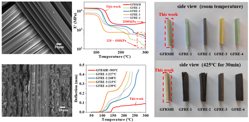 论文报道了一种玻璃纤维增强复合材料的制备工艺及综合性能,其基体树脂为生物质增强热固性树脂复合材料创新团队前期开发的高性能热固性树脂(Chemical Engineering Journal, 2023, 2023,461,141886),是高性能树脂在实际应用中的体现。研究结果表明,该复合材料在极端高温和低温下的耐受性能、力学强度方面都远超具有代表性的商业化环氧树脂复合材料。在不使用添加剂的情况下,复合材料在绝缘性能、导热性能以及阻燃性能上也可与商业化产品媲美。复合材料优异的综合性能来源于基体树脂出众的热稳定性、强韧性及界面相容性。目前该创新团队仍围绕树脂自身优势开展其他高性能材料的研究,以充分挖掘该种新型树脂的应用潜力,尤其是在木材胶黏剂及天然纤维增强材料领域的应用。