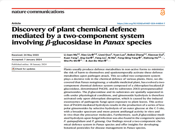 朱有勇和何霞红分别作学术报告。朱有勇院士介绍带领团队开展脱贫攻坚和乡村振兴,把论文写在大地上的生动实践,为澳门学子讲述了一堂栩栩如生的思政课,并与研究院的师生对构建林下三七全产业链和发展进行了交流探讨。何霞红教授紧扣林下中药材生态种植新模式,介绍团队利用广袤的森林,如何从农业的角度种出好药材,讲解了利用生境耦合和物种互作的生物多样性原理有效防控病虫害,为保证中药材质量开展的一系列研究工作。访问团还参观了澳门大学中药质量研究国家重点实验室和中华医药研究院,就正在合作的项目“植物防御与三七皂苷转化”研究与澳门大学万建波教授团队开展了深入研讨,双方合作研究成果于2024年1月18日在国际高水平期刊Nature Communications在线发表(2022年的影响因子为16.6)。