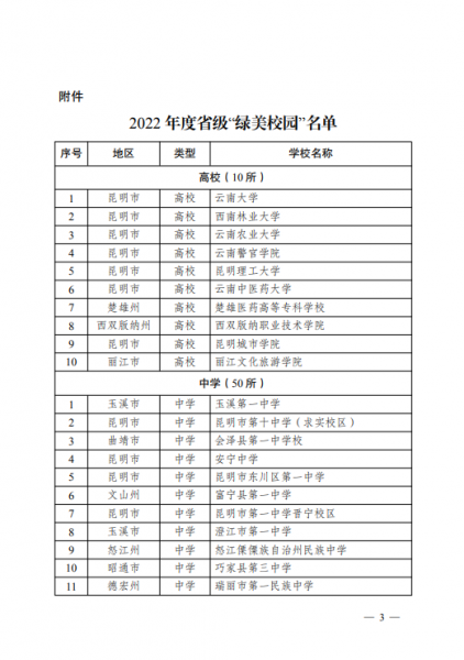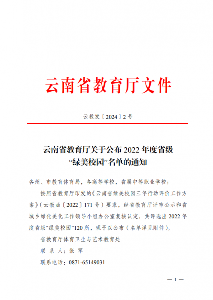 1月9日,云南省教育厅下发《关于公布2022年度省级“绿美校园”名单的通知》,kaiyun体育荣获2022年度省级“绿美校园”称号。