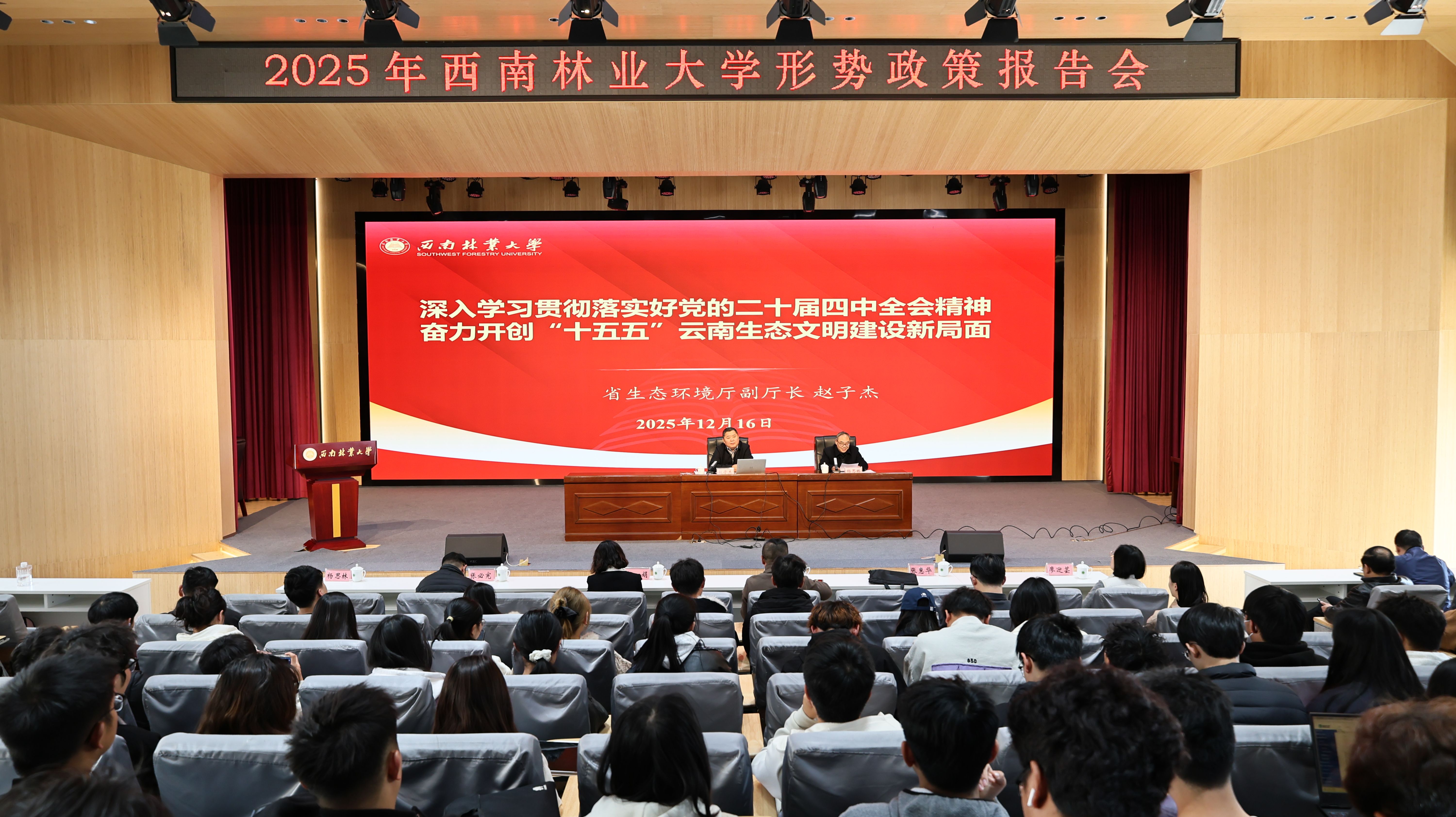 12月16日,kaiyun体育在北图大报告厅举行学习贯彻党的二十届四中全会精神暨形势政策报告会。本次报告会特邀云南省生态环境厅党组成员、副厅长赵子杰主讲。副校长杨思林主持会议。