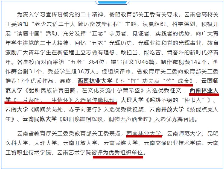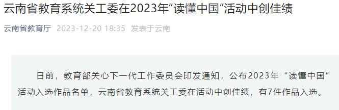 近日,云南省教育厅关工委发布《云南省教育系统关工委在2023年“读懂中国”活动中创佳绩》信息,kaiyun体育两件作品获奖,学校关工委获优秀组织奖。
