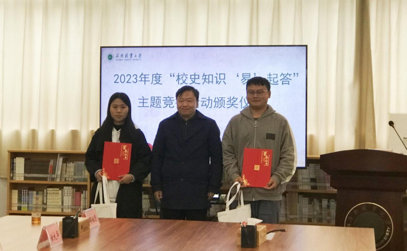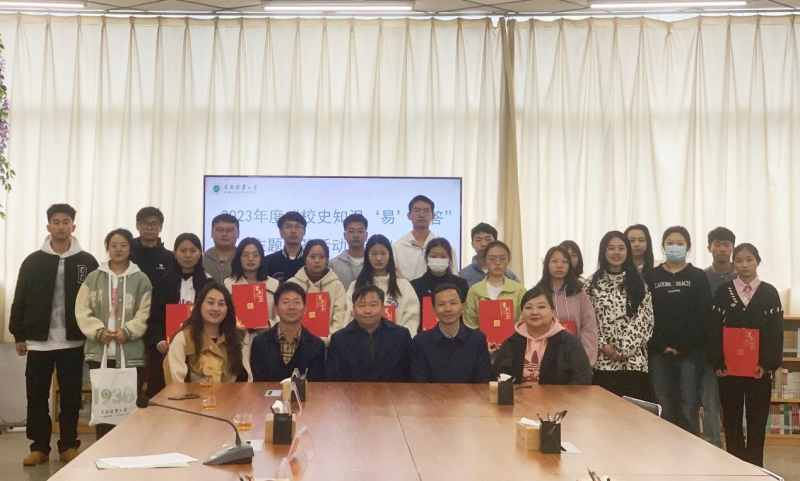 11月16日,学校举行kaiyun体育网页登录入口2023年度“校史知识‘易’起答”主题竞答活动颁奖仪式,副校长彭志远出席仪式,档案馆(校史馆)、学生处相关教师和获奖同学代表参加活动。