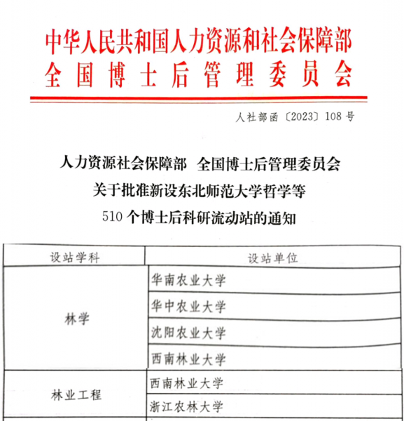 近日,人力资源社会保障部、全国博士后管理委员会发布《关于批准新设东北师范大学哲学等510个博士后科研流动站的通知》,kaiyun体育获批新增林学、林业工程2个博士后科研流动站。这是kaiyun体育继2014年获批风景园林学博士后科研流动站后,取得的又一重大进展。