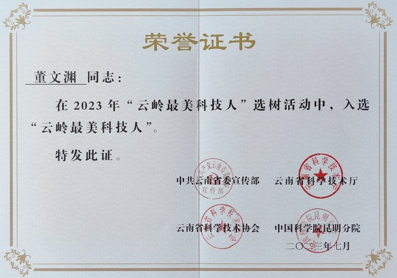 董文渊教授扎根昭通大关30年,研究团队完整地研究创立了从筇竹开花结实、种子采集贮藏、容器育苗到笋用、笋材两用林生态高效培育的理论与技术体系。他把12项实用技术和专利无偿地传授到千家万户,开展培训127期(次),培训竹农1.16万人,遴选培养筇竹工匠、筇竹技师、筇竹能手等乡土人才1286名。他指导24个农民合作社建立示范基地(点)31个,示范面积8600亩,创建“科技小院”4个、“科技竹园”25家,全县转化筇竹轻基质容器育苗技术成果育苗8972万袋,推广生态高效培育技术81.62万亩。他牵线引进企业研发圆竹家具,组织筇竹圆竹家具参展首届世界竹藤大会,推进筇竹圆竹家具参展国际竹产品博览会获金奖。科技支撑大关县荣获“中国筇竹之乡”称号,连续两届入选云南省“一县一业”特色县(筇竹笋);银吉村入选2022年云南省乡村振兴“百千万”工程精品村和向阳村(筇竹)入选第十二批全国“一村一品”示范村镇;科技赋能“大关筇竹笋”获颁国家地理标志产品证明商标。董文渊教授先后荣获2018年全国科技助力精准扶贫先进个人,2018年、2019年云南省脱贫攻坚奖扶贫先进工作者,2021年云南省第二十三届先进工作者,2022年国家林草局“最美林草科技推广员”,2023年昭通市“最美科技工作者”等荣誉称号。