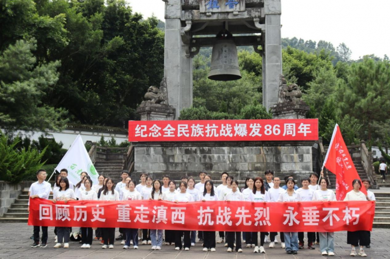 图为师生在滇西抗战纪念馆旁警钟前的合影