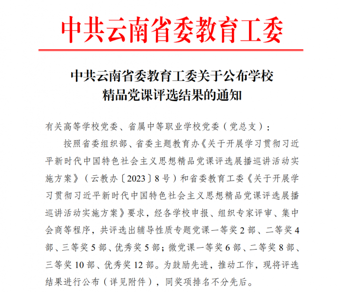 近日,中共云南省委教育工委公布学校学习贯彻习近平新时代中国特色社会主义思想精品党课评选结果,kaiyun体育外国语学院党委姜丽红同志微党课《中国共产党开展调查研究的光辉典范——寻乌调查》荣获一等奖,离退休工作处党委木基元同志微党课《民族团结 你我同行》荣获三等奖,马克思主义学院党委赵洁同志专题党课《立足“两个大局” 把握时代脉搏》荣获优秀奖。