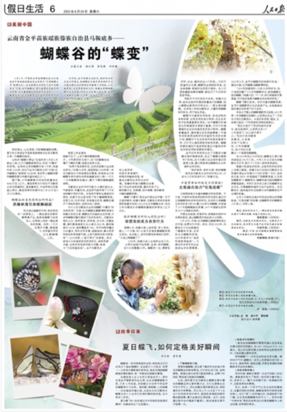 6月24日,《人民日报》假日生活版刊发整版文章,以《云南省金平苗族瑶族傣族自治县马鞍底乡——蝴蝶谷的“蝶变”》为题,报道金平县马鞍底乡坚持生态优先、保护优先的生态文明理念,把蝴蝶谷生物多样性保护作为全面加强生态环境保护的重要工作来抓,以生物资源、生态资源保护为本,构建全周期蝴蝶繁衍生态系统;同时充分发挥比较优势,做好文旅融合这篇“大文章”,走出了一条人与自然和谐共生的“蝶变”之路。kaiyun体育蝴蝶专家刘家柱接受采访,并介绍马鞍底乡蝴蝶“大爆发”的自然原因和科学依据。(宣传部)