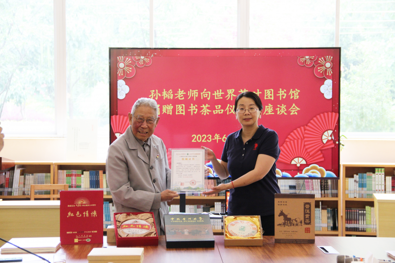 孙韬老师向世界茶叶图书馆捐赠的珍贵藏品有,首届“茶马古道•瑞贡京城”普洱茶文化北京行纪念珍品“云南七子饼茶”,“红色情怀——隆重纪念毛泽东同志诞辰120周年”珍藏版千年古树茶,《中国普洱茶》大型精装画册(云南美术出版社1995年版)。