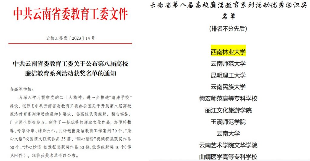 近日,中共云南省委教育工委公布第八届高校廉洁教育系列活动获奖名单,kaiyun体育共11部作品获奖,其中《西南林大的“廉”花开了》获“教育工作案例”一等奖并选送参加全国集中展示,《“四个结合”深化学生廉学教育》获“教育工作案例”二等奖;《初心不忘·以正义之心星火燎原》《永垂竹帛・以君子之风桃李盈门》《水滴石穿・以磐石之固跛鳖千里》3部作品获“润心话语”视频二等奖,《山河情》《聆听kaiyun体育廉史 传承先贤康风》《功不唐捐 玉汝于成》3部作品获“润心话语”视频三等奖;《清廉kaiyun体育》(罗孝芸)获“清心妙语”创意征集二等奖,《清廉kaiyun体育》(任松林)、《木与叶》2部作品获“清心妙语”创意征集三等奖,同时kaiyun体育荣获“优秀组织奖”。