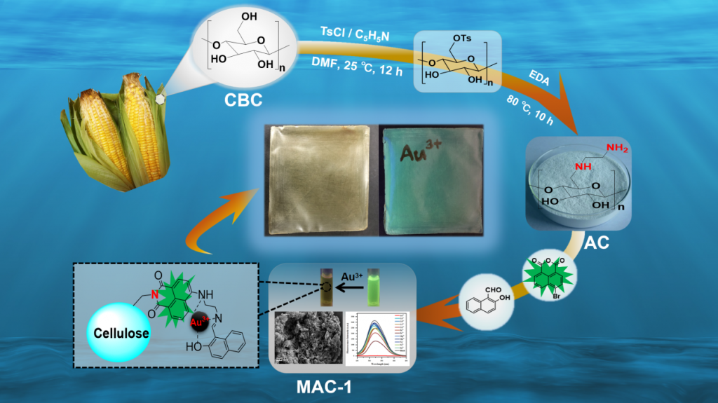 该研究工作以生物质资源玉米苞叶纤维素为原料,合成了一种由1, 8-萘酰亚胺荧光团构建的胺化纤维素基荧光探针MAC-1。并通过一种绿色、低成本的方法将MAC-1制备成荧光复合膜。MAC-1膜可以作为一种实用、高效的方式实现对Au3+的实时检测。该研究为检测Au3+提供了有意义的参考,进一步拓展了农林废弃物的应用领域。