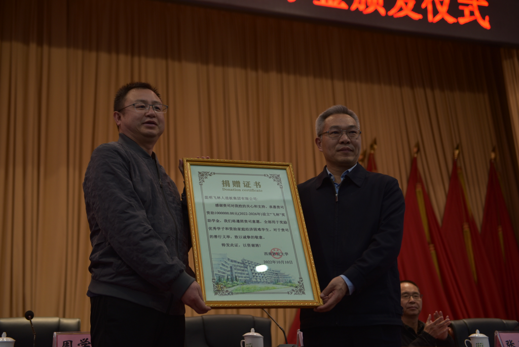 4月6日,2022年“飞林”奖助学金颁发仪式在第一图书馆大报告厅举行。校党委书记周学斌、副书记刘清江,昆明飞林人造板集团有限公司党委书记、副董事长毛顺国,党委副书记、纪委书记张春芳,行政总监晏菲等出席仪式。学生处、各二级学院学工干部及学生代表参加。