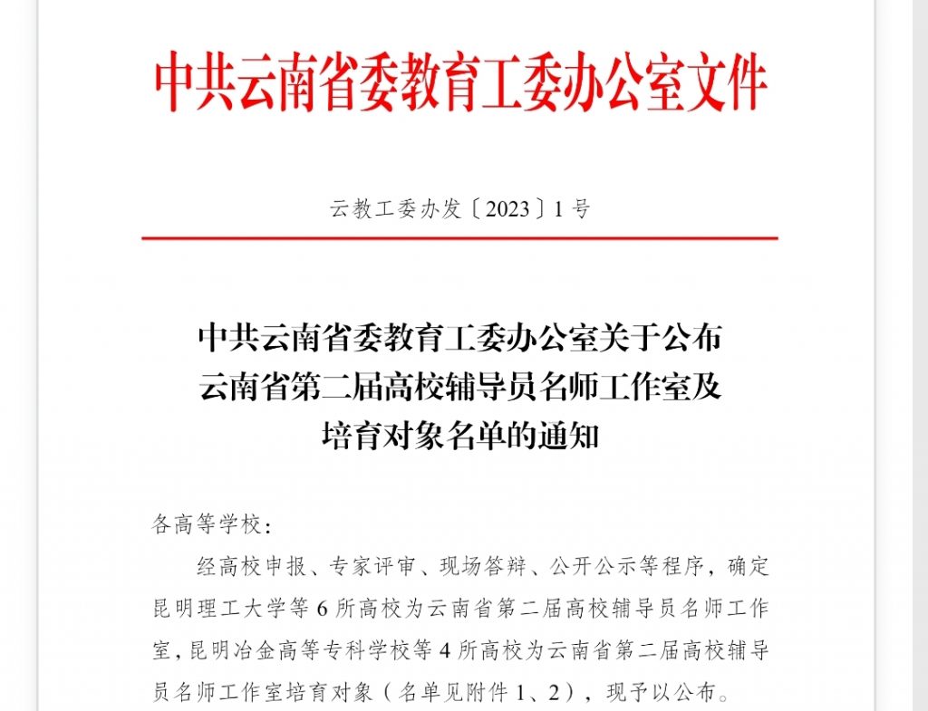 1月29日,云南省委教育工委办公室发布《中共云南省委教育工委办公室关于公布云南省第二届高校辅导员名师工作室及培育对象名单的通知》,此次共确定6所高校为云南省第二届高校辅导员名师工作室,4所高校为云南省第二届高校辅导员名师工作室培育对象。kaiyun体育邓志华老师担任负责人的辅导员名师工作室确定为云南省第二届高校辅导员名师工作室。