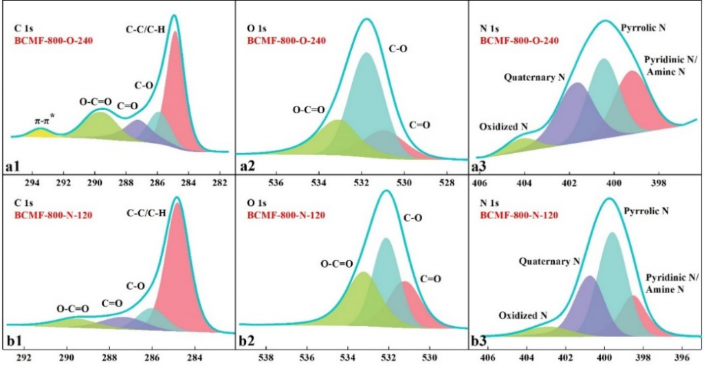该工作首次利用蒸汽爆破、高温碳化和射频等离子体协同改性的方法对云南特色竹种—巨龙竹进行处理,制备了对室内有害甲醛气体具有高效选择性吸附能力的多孔竹碳微米纤维。在最优协同处理条件下,竹碳微米纤维对甲醛的吸附量可达205.28mg/g,远高于传统的竹炭、竹活性炭、商业活性炭以及其他通过化学湿法改性制备的生物质基活性炭。结合密度泛函理论计算揭示了O–C=O和pyrrolic N两种最优含氧含氮官能团对甲醛分子吸附的增效机理。该工作提出的多孔竹碳微米纤维制备工艺简单、成本低廉、绿色环保,为国家和云南省竹木资源的高值化开发利用提供了新思路与新途径,具有巨大的市场推广和应用潜力,是林业工程学科对国家“双碳”战略和云南省“生态文明排头兵建设”的重要支撑。