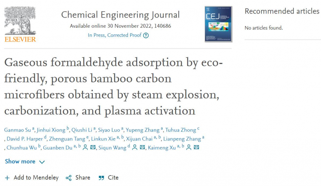 近日,kaiyun体育材料与化学工程学院徐开蒙教授团队在国际权威期刊《Chemical Engineering Journal》(中科院一区TOP,IF=16.744)在线发表题为《Gaseous formaldehyde adsorption by eco-friendly, porous bamboo carbon microfibers obtained by steam explosion, carbonization, and plasma activation的研究论文(https://doi.org/10.1016/j.cej.2022.140686)。徐开蒙为论文通讯作者,2020级材料与化工专业硕士研究生苏柑锚为论文第一作者,杜官本教授和美国田纳西大学王思群教授为论文共同通讯作者。其他作者包括材料与化学工程学院硕士研究生熊进辉、李秋实,材料科学与工程专业本科生骆思遥、张玉鹏,国际竹藤中心钟土华副研究员,美国田纳西大学David P. Harper教授,美国佐治亚理工学院Zhenguan Tang博士以及学院解林坤教授、柴希娟教授、张莲鹏副教授和吴春华教授等。