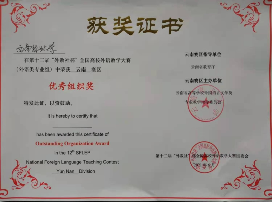 学院团委、工会在学院党委的指导下扎实开展工作,“外语舞台剧大赛”获学校“十大精品校园文化活动”,3个社团均由党员教师担任指导教师开展工作,把握好方向,创新好特色。学院连续5年获学校 “五四红旗团委”“优秀学生会”等称号,2022年获“云南省五四红旗团委”称号,暑期“三下乡”社会实践活动项目连续2年获“全国优秀报道奖”,外语协会获kaiyun体育网页登录入口2021年度“精品社团”。学院工会依托“职工小家”活动阵地,积极为群众办实事、解难事,多次获校级比赛奖项,2020年获“云南省教育、卫生、科研系统模范职工小家”称号。近年来,学院不断加强教师、学生竞赛项目培育,成效突出。在“外教社杯”全国大学教师教学技能比赛中,1人获国家级三等奖、4人获省级奖项,在校级教师课堂教学比赛中,2人获特等奖,2人获一等奖;1人获得第十三届全国“高校辅导员年度人物暨‘最美高校辅导员’称号”。学生党员获模拟求职招聘大赛省级金奖1项,省级铜奖1项;获简历制作大赛省级金奖1项、职业生涯规划设计大赛省级金奖1项,其他校级奖项若干。