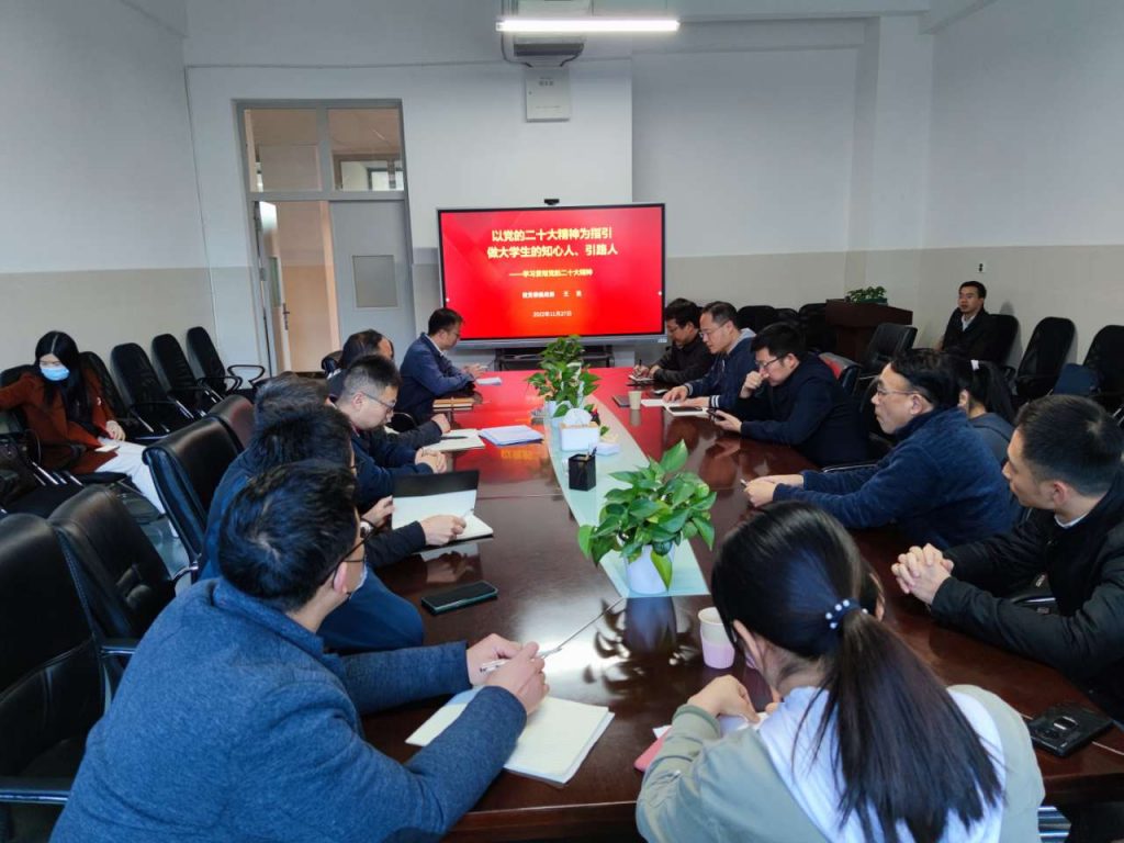 11月27日,校党委委员、统战部部长王泾为材料与化学工程学院教工第一党支部全体党员宣讲党的二十大精神。会议由学院党委副书记(主持工作)孙浩主持,支部全体党员参加会议。