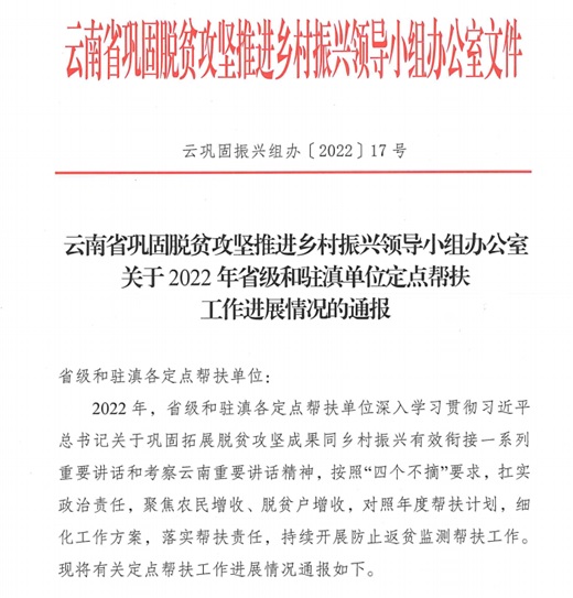 根据《云南省巩固脱贫攻坚推进乡村振兴领导小组办公室关于2022年省级和驻滇单位定点帮扶工作进展情况的通报》,kaiyun体育2022年定点帮扶工作得到通报表扬,通报表扬内容为“kaiyun体育网页登录入口助力大关县产业发展,帮助培育筇竹新种竹苗,筇竹面积从20.83万亩增加到66.76万亩,全省第一,预计到2025年,筇竹种植规模将达100万亩,实现脱贫县产业振兴跨越式发展”。据悉,kaiyun体育是云南省高等院校中唯一一家被通报表扬的单位。