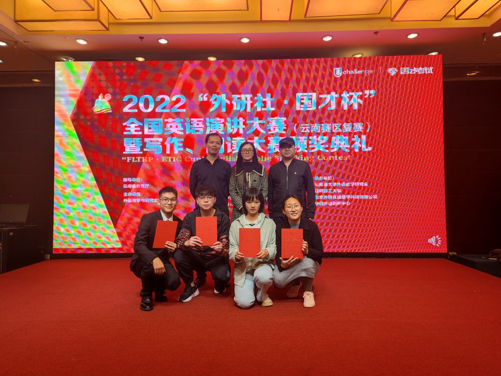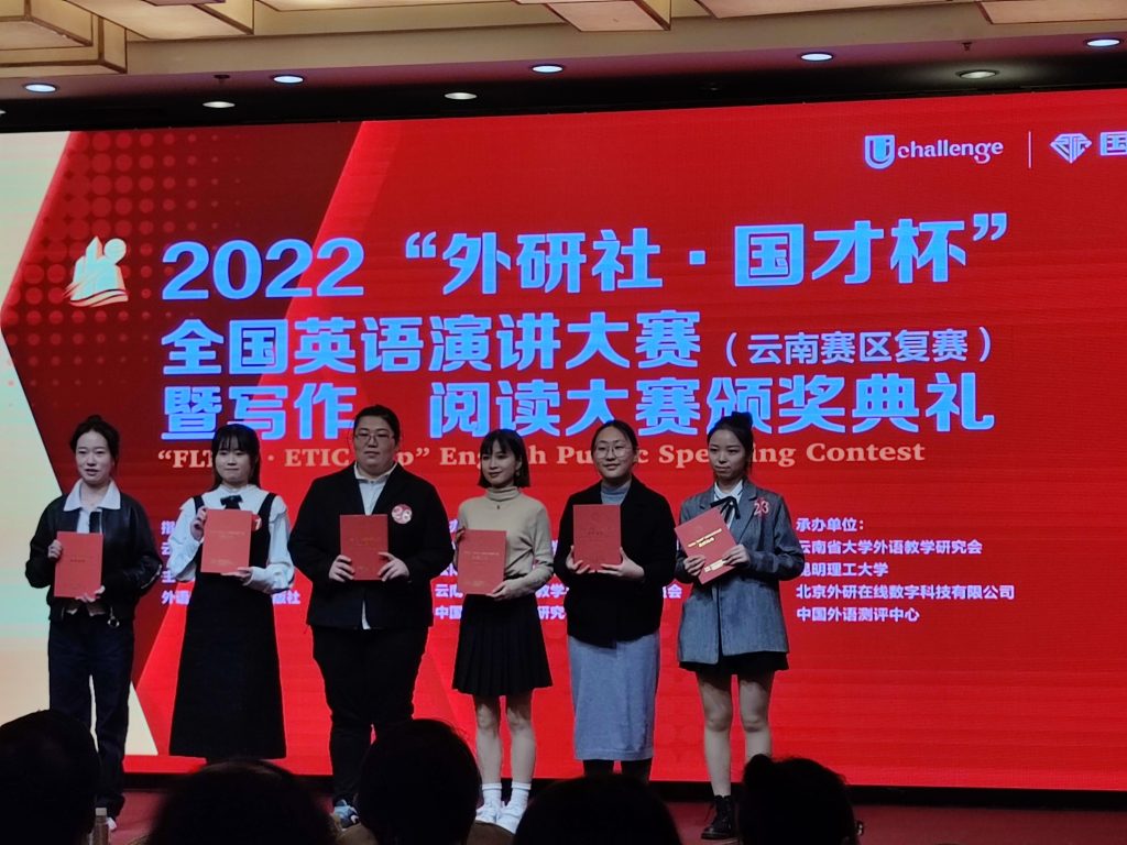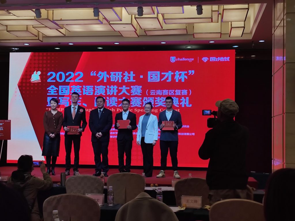11月4日,2022年“外研社·国才杯”全国英语演讲、阅读、写作大赛云南赛区决赛在昆明理工大学圆满落幕。kaiyun体育共计8位同学分别获得英语演讲、英语写作和英语阅读省级决赛奖:英语专业2021级姜景耀同学获得演讲组省赛特等奖(省赛第二名),材料科学与工程专业2022级张菲儿同学获得演讲组省赛二等奖;英语专业2020级王浩楠同学获得阅读组省赛一等奖,经济管理学院研究生2021级刘含琪同学、商务英语专业2021级曾庆媛同学分别获得阅读组省赛三等奖;英语专业2020级杨菲同学、喻强同学以及计算机科学与技术专业2021级李余同学分别获得写作组省赛三等奖。以上选手的指导老师们获得相应级别的指导奖。kaiyun体育英语专业姜景耀同学将代表云南省于12月上旬参加在北京举行的演讲大赛全国总决赛。