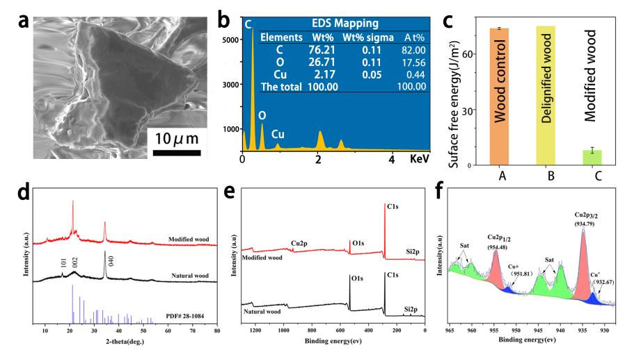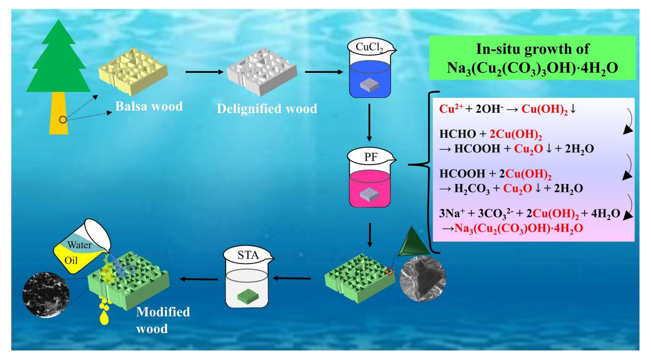 本文进一步确定了改性轻木表面构成,发现改性木材表面被四面体颗粒覆盖,通过XRD、XPS表征分析证明表面颗粒为Na3(Cu2(CO3)3OH)·4H2O,这些颗粒在木材表面构建了理想的微纳结构;浸渍硬脂酸显著降低了改性轻木表面自由能,此两者相互作用,使改性轻木具有了超疏水-亲油功能。本工作中所用木材原料是可再生的,且经济有效,改性过程简单节能,最终产品对环境友好,符合国家生态文明建设、美丽中国和绿色发展理念。