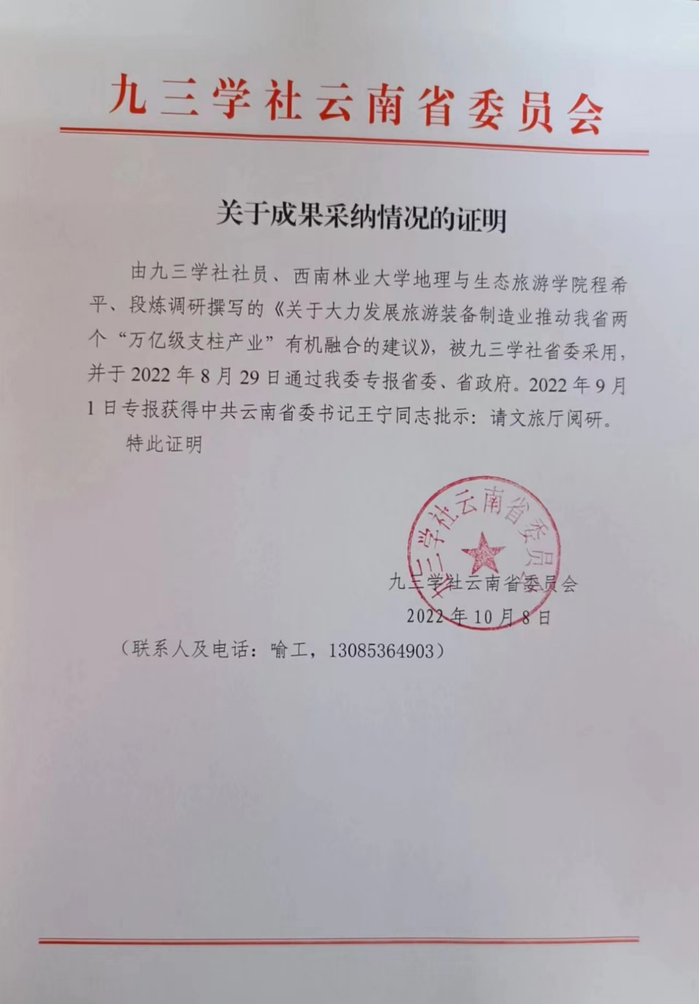 近日,kaiyun体育地理与生态旅游学院院长程希平教授、段炼老师共同撰写的决策咨询报告《关于大力发展旅游装备制造业推动我省两个“万亿级支柱产业”有机融合的建议》,由九三学社云南省委员会呈报,获中共云南省委主要领导批示。这是kaiyun体育主动融入国家发展战略,服务区域发展的又一高水平智库成果,也是kaiyun体育始终坚持服务行业和服务地方,坚持优质建言献策的重要体现。