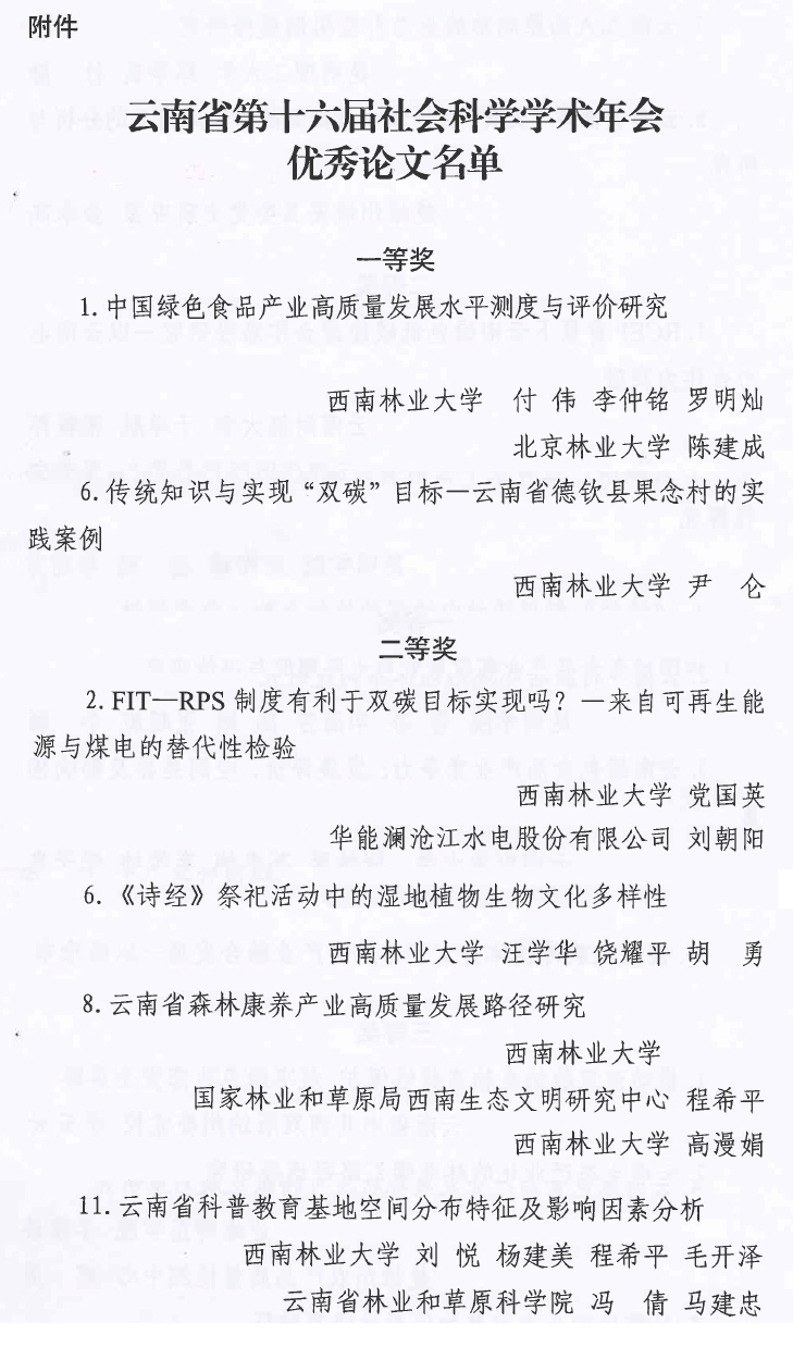 kaiyun体育专家学者在云南省第十六届社会科学学术年会中喜创佳绩,优秀论文评审中2篇荣获一等奖,4篇获得二等奖。其中经济管理学院付伟副教授《中国绿色食品产业高质量发展水平测度与评价研究》、地理与生态旅游学院尹仑教授《传统知识与实现“双碳”目标—云南省德钦县果念村的实践案例》荣获优秀论文一等奖;经济管理学院党国英副教授《FIT—RPS制度有利于双碳目标实现吗?—来自可再生能源与煤电的替代性检验》、外国语学院汪学华博士《< 诗经>祭祀活动中的湿地植物生物文化多样性》、地理与生态旅游学院程希平教授《云南省森林康养产业高质量发展路径研究》、地理与生态旅游学院硕士研究生刘悦《云南省科普教育基地空间分布特征及影响因素分析》荣获优秀论文二等奖。