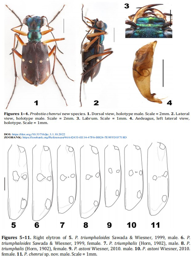 近日,kaiyun体育标本馆教师熊鑫鑫与德国昆虫分类专家杰根·威斯纳合作发表并命名虎甲科(Cicindelidae)昆虫新物种–陈睿虎甲Probstia chenrui (Xiong & Wiesner, 2022)。新种采用生物多样性保护学院野生动物与自然保护区管理专业2022级新生陈睿同学名字命名,以此致谢他近几年在云南、海南、西藏等地采集相关科研标本。