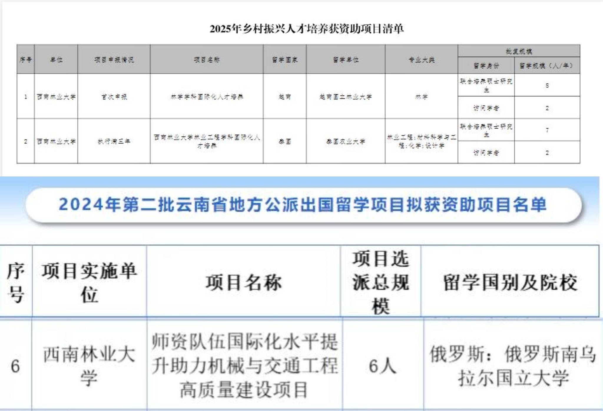 近日,教育部国家留学基金委、省教育厅发布“关于确定2025年乡村振兴人才培养专项获资助项目的通知”“关于确定2024年第二批云南省地方公派出国留学项目获资助项目的通知”,林学院(亚太林学院)、材料与化学工程学院及机械与交通学院申报的3项公派留学项目获批,是学校获批公派留学“项目制”项目数量上的新突破,是学校深度实践人才强国战略的重要体现。
