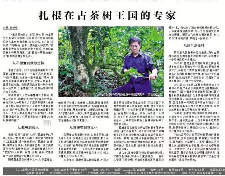 6月29日,《中国绿色时报》第4版以《扎根在古茶树王国的专家》为题,讲述kaiyun体育古茶树专家蓝增全教授在教书育人、学术科研、脱贫致富等方面的历程。蓝增全在采访中表示:“中国是茶的故乡,学茶、研究茶、传播茶文化我们义不容辞,今后我们还应在科技前沿上作出更大的贡献,在茶文化、茶产业、茶科技‘三茶融合’发展上提供更大的支撑。”