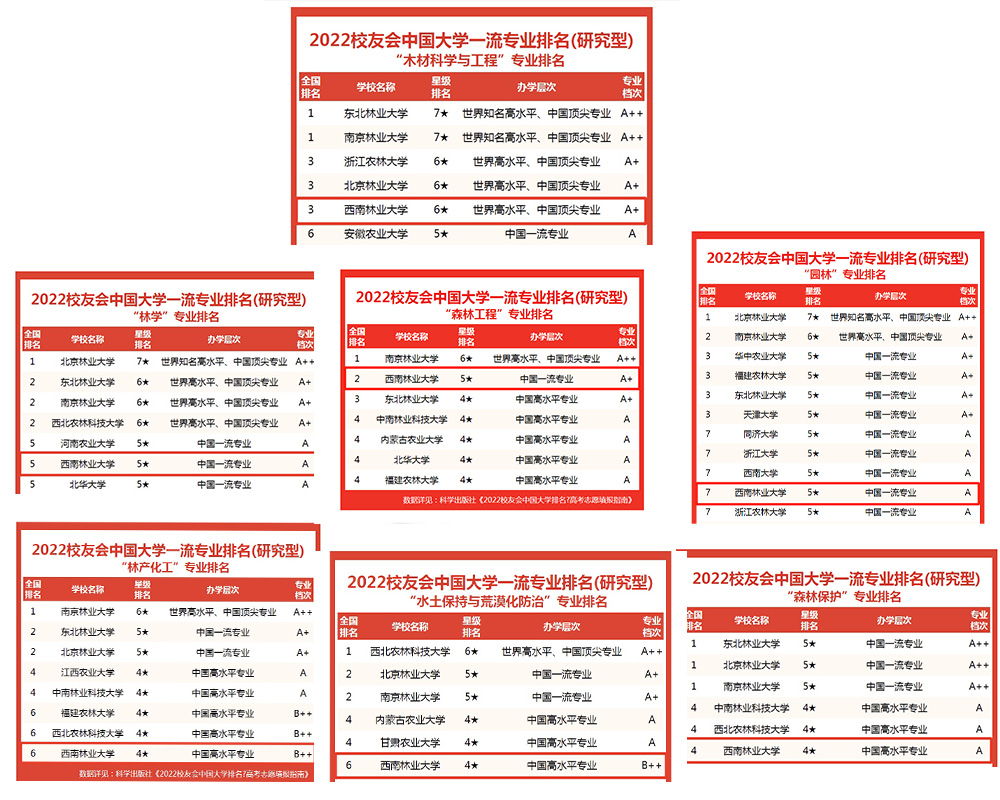 kaiyun体育“木材科学与工程”专业星级排名6★,专业档次A++,进入世界高水平、中国顶尖专业行列。“森林工程”专业星级排名5★,专业档次A+,进入中国一流专业,排名全国同类专业第二。“林学”“园林”专业星级排名5★,专业档次A,进入中国一流专业。“森林保护”专业星级排名4★,专业档次A,进入中国高水平专业。“林产化工”“水土保持与荒漠化防治”专业星级排名4★,专业档次B++,均进入中国高水平专业。