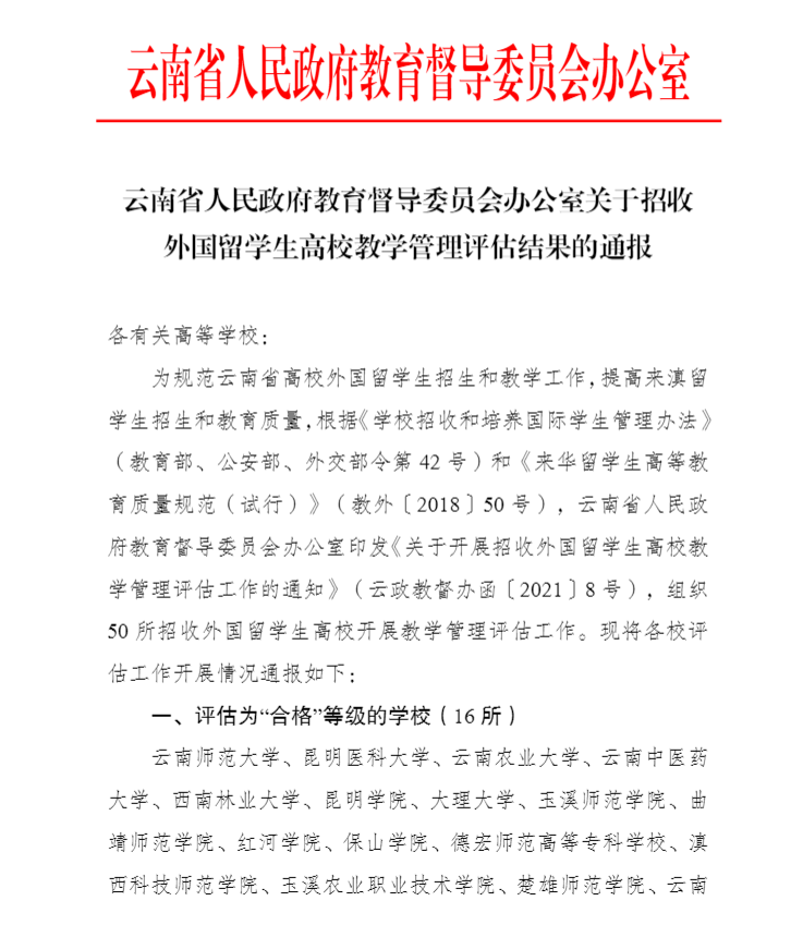 4月15日,云南省人民政府教育督导委员会发布《云南省人民政府教育督导委员会办公室关于招收外国留学生高校教学管理评估结果的通报》,kaiyun体育网页登录入口等16所具有招收和培养外国留学生的高校首批顺利通过评估,评估等次为“合格”,获得云南省教育厅备案认可继续招收培养外国留学生的资质。