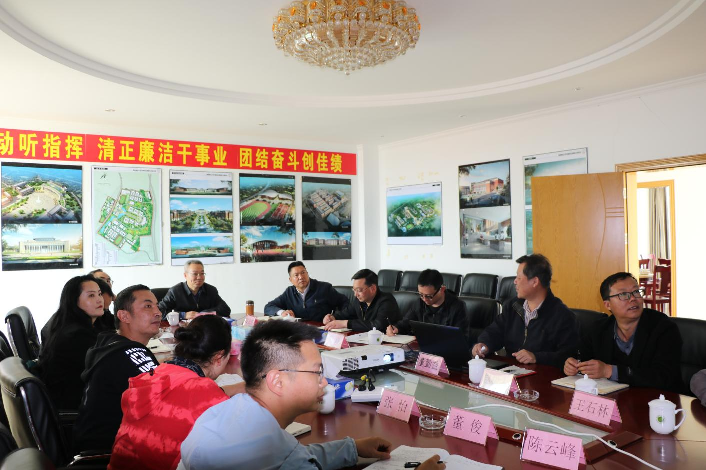 现场踏勘后在指挥部会议室召开了座谈会,石林校区建设指挥部副指挥长董勤益汇报了石林校区总体规划方案、项目取得批复许可情况、一期项目进展、当前存在问题及下一步计划安排等工作。