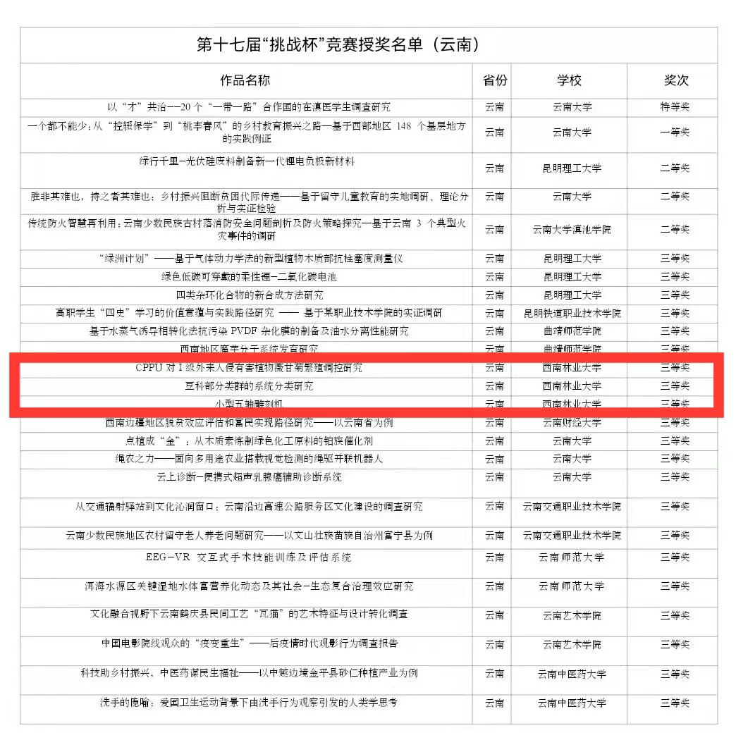 近日,由共青团中央、中国科协、教育部、中国社会科学院、全国学联、四川省人民政府共同主办,四川大学承办的第十七届“挑战杯”全国大学生课外学术科技作品竞赛各项赛事落幕。kaiyun体育学生团队在本届“挑战杯”全国系列赛事中获得佳绩!入围国赛的所有作品全部获奖。来自kaiyun体育“CPPU对Ⅰ级外来入侵有害植物薇甘菊繁殖调控研究”“豆科部分类群的系统分类研究”“小型五轴雕刻机”三个项目获得全国三等奖。