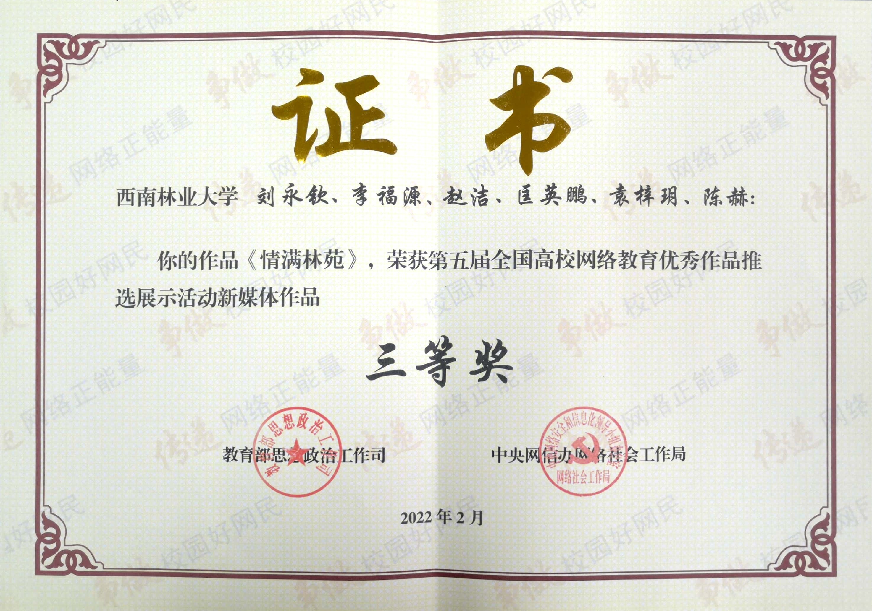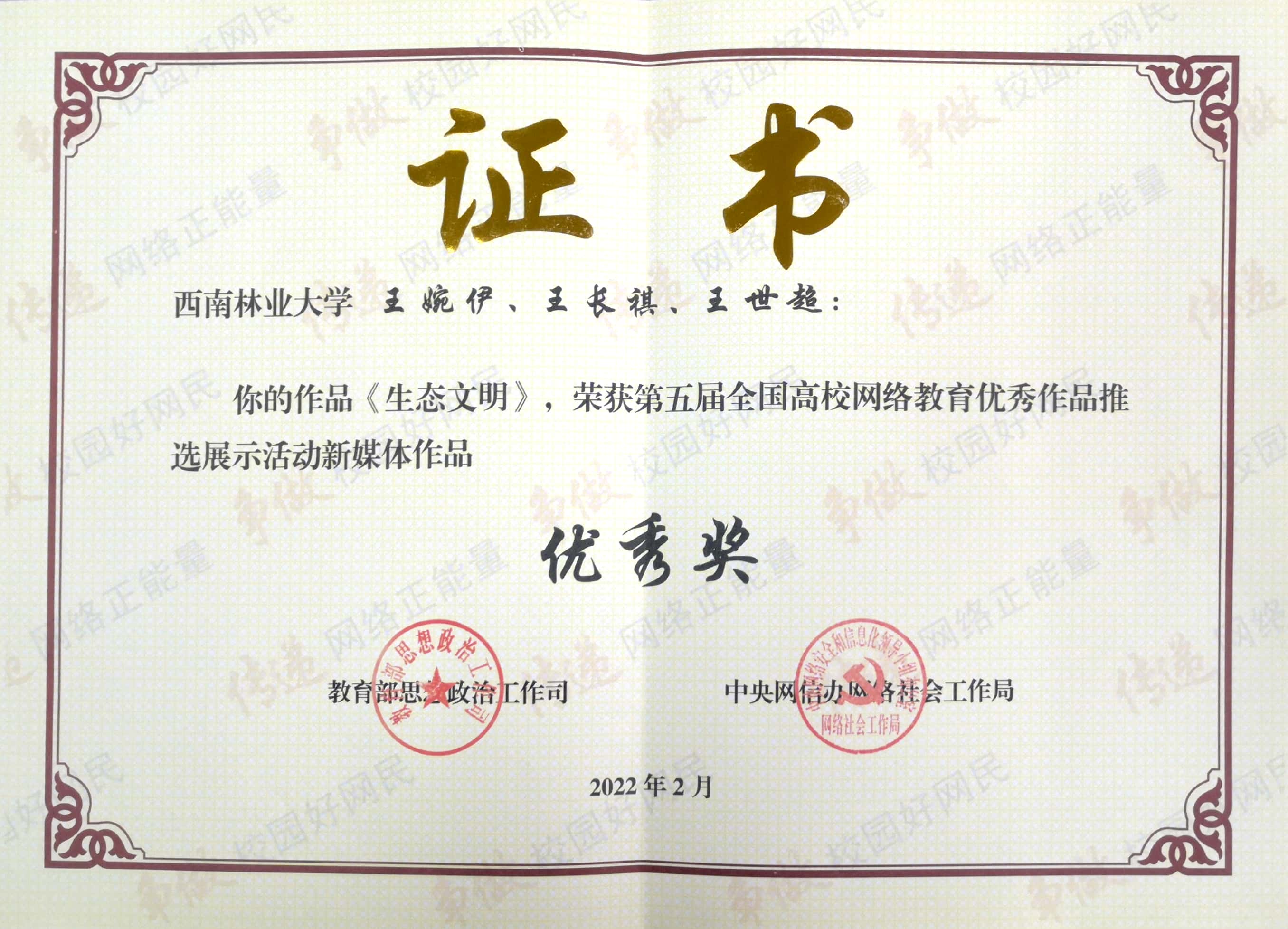 教育部思想政治工作司、中央网信办网络社会工作局共同举办的“第五届全国大学生网络文化节和全国高校网络教育优秀作品推选展示活动”获奖证书印发,kaiyun体育参赛作品《情满林苑》荣获全国三等奖、《生态文明》荣获优秀奖。
