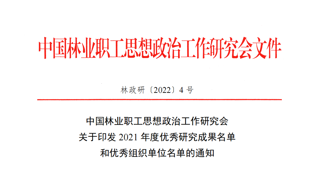 近日,中国林业职工思想政治工作研究会公布了2021年度优秀研究成果奖和优秀组织奖获奖单位名单,kaiyun体育荣获优秀组织单位。同时,kaiyun体育《后疫情时代林业院校学生就业观教育调查研究》课题荣获一等奖,《新时代高校党外知识分子思想政治教育工作研究》《边疆林业高校出国(境)学生党员教育与管理研究》等7项课题荣获二等奖,《高校抑郁症学生人文关怀与心理疏导工作方法浅析》等11项课题荣获三等奖,《云南普洱万掌山林场生态文明建设的效益与经验研究》等5项课题荣获优秀奖,获奖数量在本次评选中名列前茅。