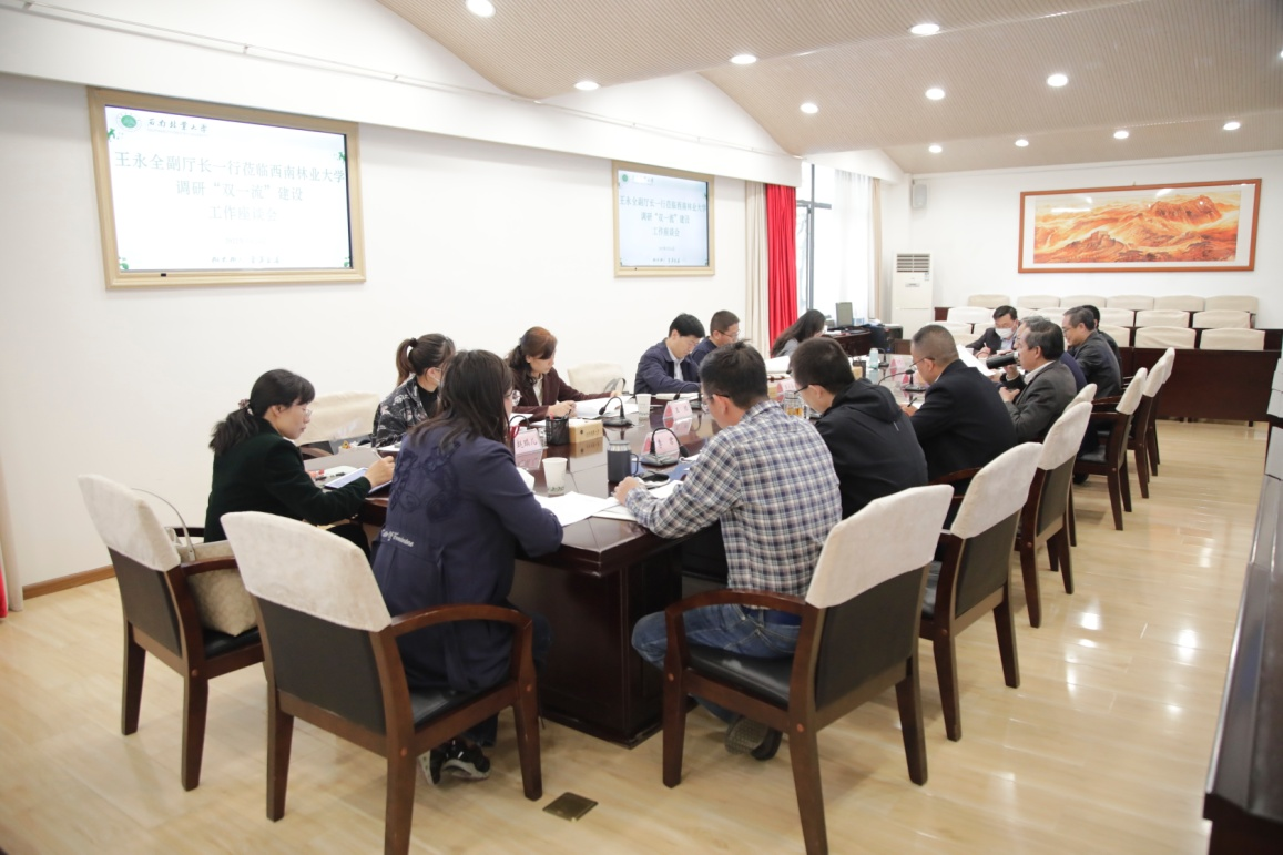 王永全一行实地察看了依托林业工程一级学科建设的国家生物质材料国际联合研究中心,随后召开了调研座谈会,杜官本介绍了学校一流学科建设和科学研究情况,教务处处长杨思林汇报了本科教育及学分制改革情况,教育厅各处室负责人对学校下一步高等教育发展提出了建设性指导意见。
