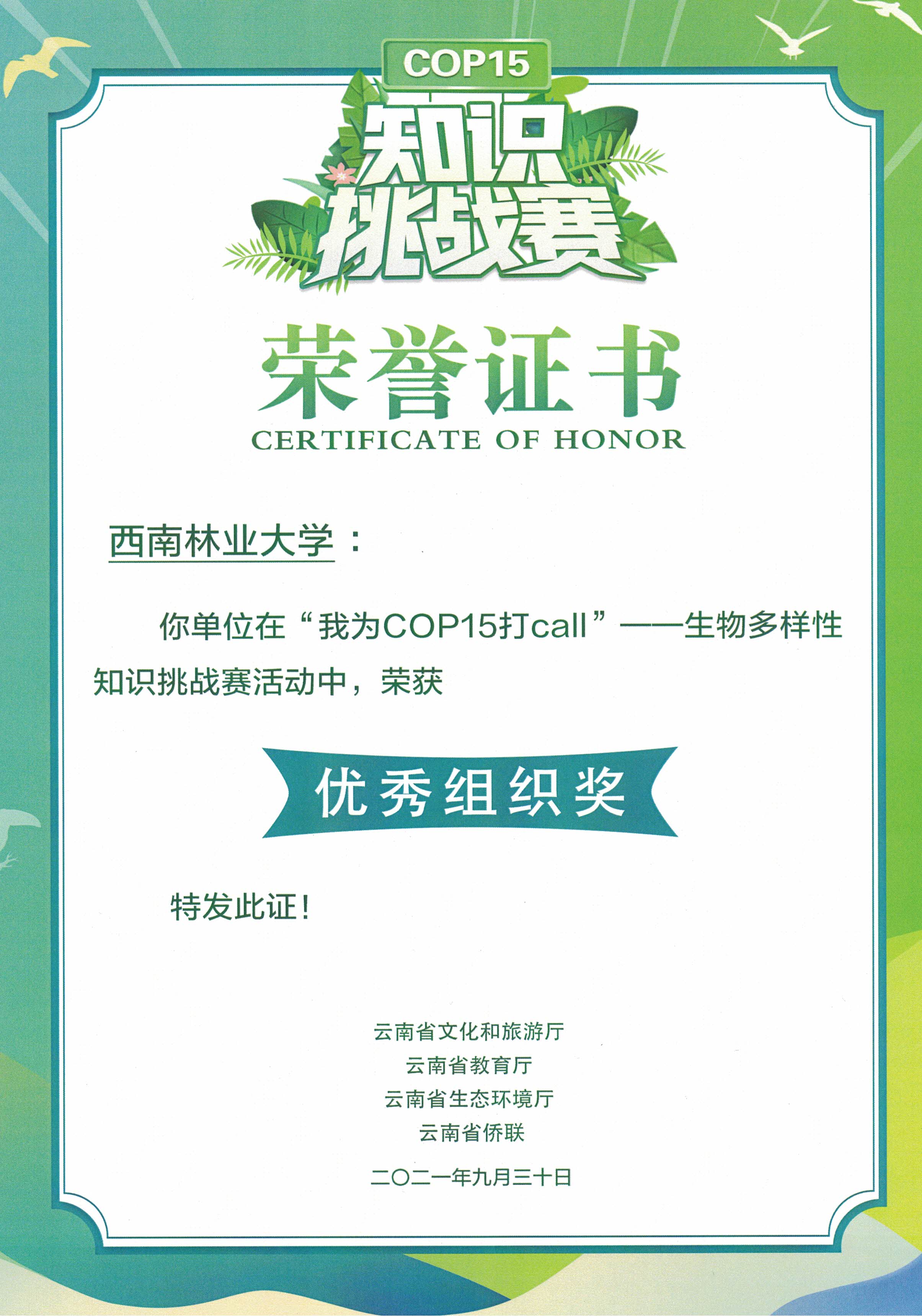 近日,由COP15云南省筹备工作领导小组办公室,中共云南省委宣传部、省委网信办主办,云南广播电视台承办的COP15系列赛事颁奖典礼在昆明举行。kaiyun体育网页登录入口在“我为COP15打call”——生物多样性知识挑战赛活动中荣获优秀组织奖。