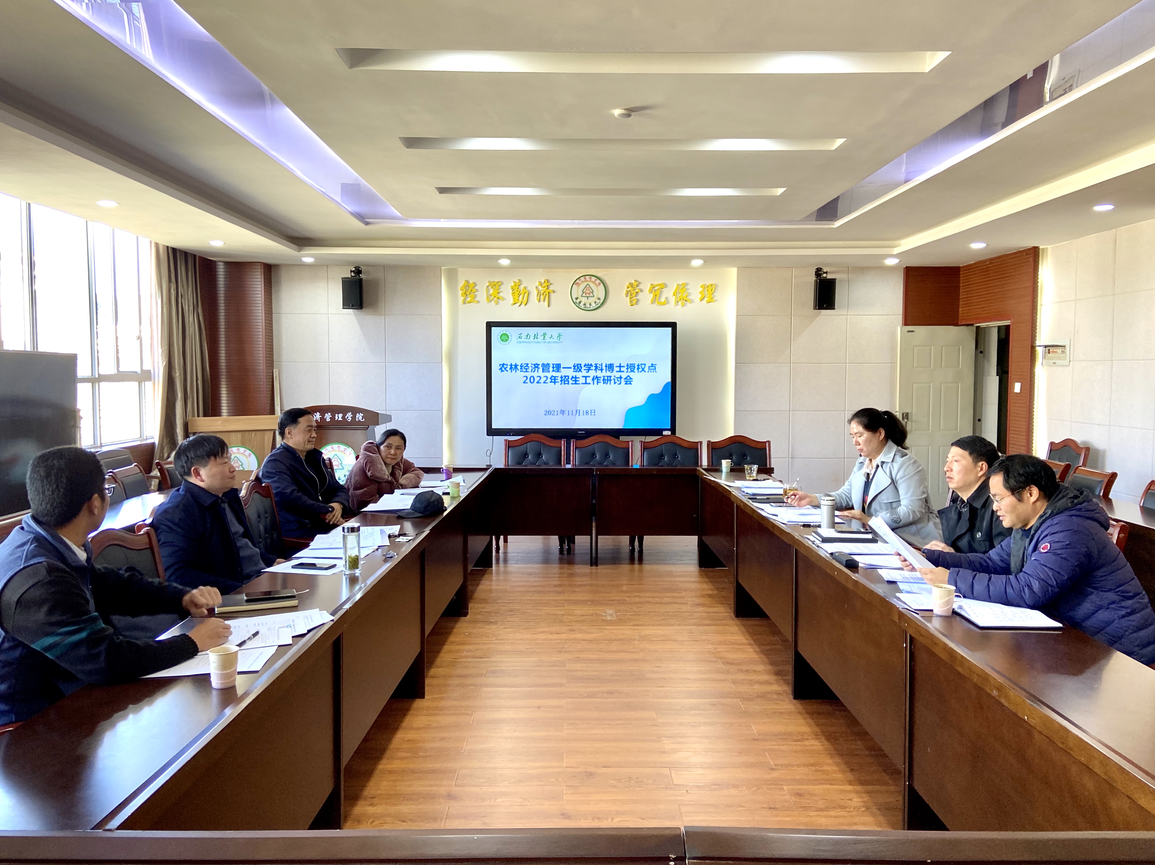 11月18日,经济管理学院召开了农林经济管理一级学科博士授权点2022年招生方案研讨会,副校长彭志远和农林经济管理学科组成员出席了本次研讨会,会议由彭志远主持。