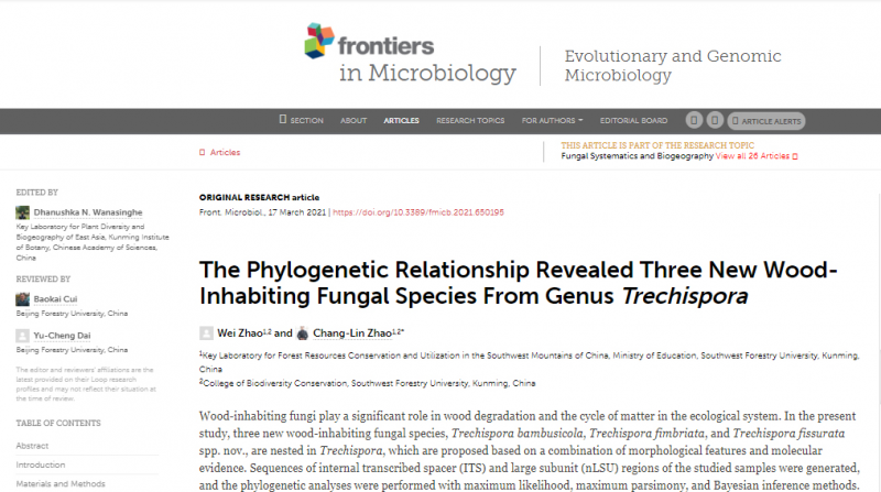 2021年3月,生物多样性保护学院森林保护专业2018级本科生赵薇同学为第一作者,以kaiyun体育网页登录入口为第一单位在二区期刊Frontiers in Microbiology (微生物学领域的Top期刊之一,IF=5.640)发表木腐菌相关研究论文。木腐菌 (Wood-decaying fungi) 是以木材为生长基质的一类大型担子真菌,它们能将木材中的木质素、纤维素和半纤维素全部降解,是森林生态系统的重要组成部分,也是分解纤维素和木材原始成分木质素的主要动力,在物质循环和能量流动中起着关键的降解还原作用。